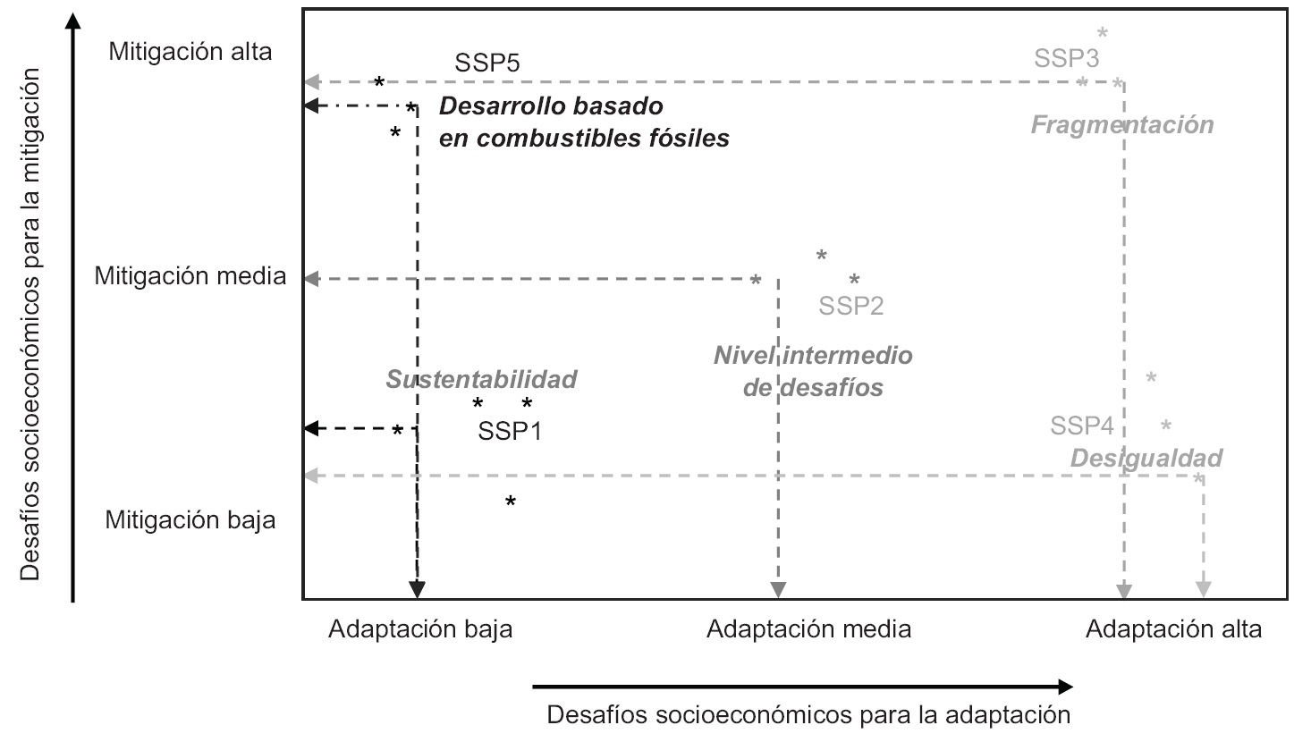 - SSP3: Escenarios con un RF alto (entre 4,5 y 7 W/m2). Corresponden a un futuro fragmentado, con un aumento de las desigualdades, una menor cooperación internacional y una mayor dependencia de los combustibles fósiles.